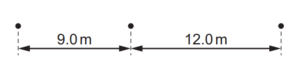 A car moves with uniform acceleration along a straight road. Oil leaks from the car at the rate of one drop every two seconds. The diagram shows the distances between three successive oil drops on the road.