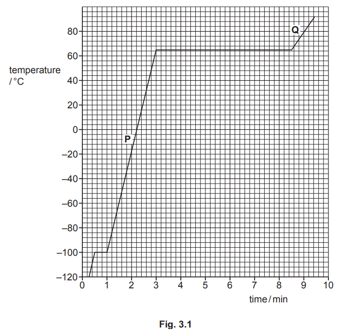 (c) A heater supplies energy at a constant rate to 0.045kg of a substance. The variation with time of the temperature of the substance is shown in Fig. 3.1. The substance is perfectly insulated