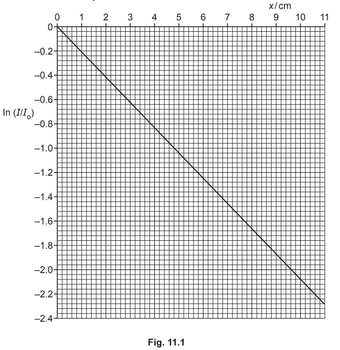 (b) A beam of X-rays has an initial intensity Io. The beam is directed into some body tissue. After passing through a thickness x of tissue the intensity is I. The graph in Fig. 11.1 shows the