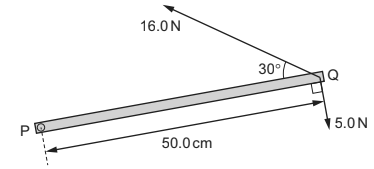 Two forces of 16.0 N and 5.0 N are in the horizontal plane and act on end Q, as shown.