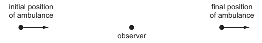 The warning signal on an ambulance has a frequency of 600 Hz. The speed of sound is \(330 m s^{–1}\). The ambulance is travelling with a constant velocity of \(25 m s^{–1}\) towards an observer. The ambulance passes, and then moves away from the observer with no change in velocity.
