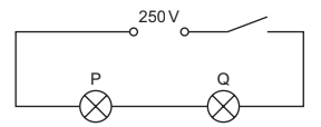 In the circuit shown, lamp P is rated 250V, 50W and lamp Q is rated 250V, 200W. The two lamps are connected in series to a 250V power supply.