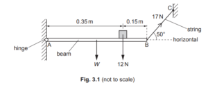 The beam has length \(0.50 \mathrm{~m}\) and weight \(W\). A block of weight \(12 \mathrm{~N}\) rests on the beam at a distance of \(0.15 \mathrm{~m}\) from end \(\mathrm{B}\).