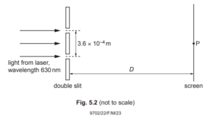 The wavelength of the light from the laser is \(630 \mathrm{~nm}\). The light is incident normally on the double slit. The separation of the two slits is \(3.6 \times 10^{-4} \mathrm{~m}\). The perpendicular distance between the double slit and the screen is \(D\).