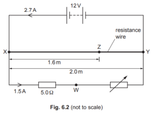 (c) A battery of electromotive force (e.m.f.) 12V and negligible internal resistance is connected to a uniform resistance wire XY, a fixed resistor and a variable resistor, as shown in Fig. 6.2.
