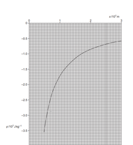 (b) Artemis is a spherical planet that may be assumed to be isolated in space. The variation with distance \(x\) from the centre of Artemis of the gravitational potential \(\phi\) is shown in Fig. 1.1.