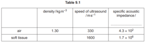 (iii) Use data from Table 9.1 to explain why ultrasound cannot be used to produce an image inside an air-filled cavity such as the lungs.