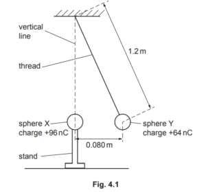 (b) A charged sphere X is supported on an insulating stand. A second charged sphere Y iss uspended by an insulating thread so that sphere Y is in equilibrium at the position shown in Fig. 4.1.