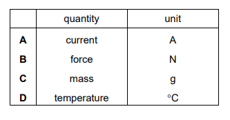 Which row shows a physical quantity and its base unit in the SI system?