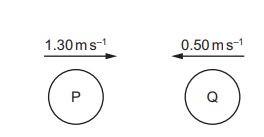 Ball P has velocity \(1.30 m s^{–1}\) to the right. Ball Q has velocity \(0.50 m s{–1}\) to the left. P and Q collide with one another. The collision is perfectly elastic and the total momentum is conserved. Which diagram correctly shows the motion of P and Q after the collision?