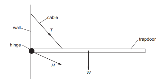A hinged trapdoor is held closed in the horizontal position by a cable. Three forces act on the trapdoor: the weight W of the door, the tension T in the cable and the force H at the hinge.