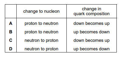 A nucleus of carbon-10, \(_{6}^{10}\textrm{C} \), decays by beta-emission to form a nucleus of boron-10, \(_{5}^{10}\textrm{B} \). For this decay process, what is the change to a nucleon and what is the change in the quark composition of the nucleon?