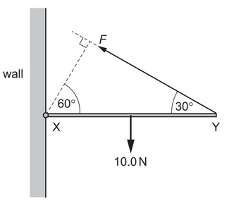 A uniform rod XY of weight 10.0N is freely hinged to a wall at X. It is held horizontal by a force F