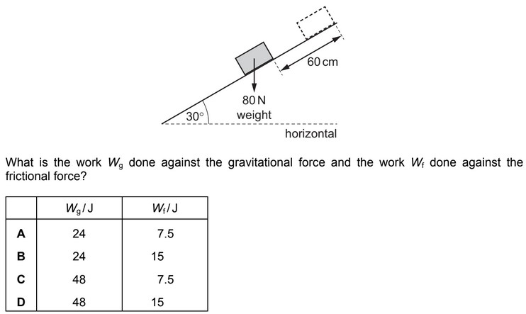 A block of weight 80 N is pushed a distance of 60 cm up a slope inclined at 30° to the horizontal.
