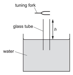 A long glass tube is almost completely immersed in a large tank of water. A tuning fork is struck