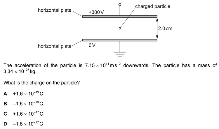 A charged particle is in a vacuum between two horizontal metal plates as shown.