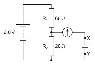 The cell is connected between terminals X and Y in parallel with \(R_2\) and in series with a