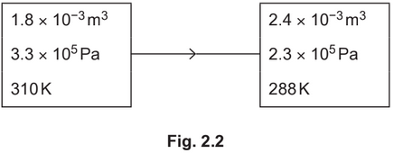 (c) The gas expands so that its volume increases to \(2.4 × 10^{−3}m^3\) at a pressure of \(2.3 × 10^5Pa\) and a temperature of 288K, as shown in Fig. 2.2.