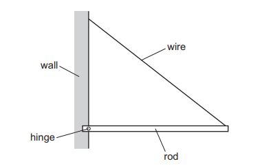 A uniform rod is attached by a hinge at one end to a wall. The other end of the rod is supported by a wire so that the rod is horizontal and in equilibrium.