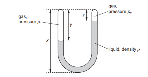 A closed U-shaped tube contains a stationary liquid of density \(\rho\). One side of the tube contains a gas at pressure \(p_1\) and the other side contains a gas at pressure \(p_2\), as shown.