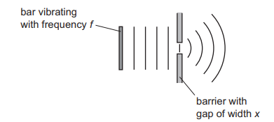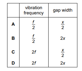 The waves pass through a gap of width x in a barrier so that diffraction occurs. Which combination of vibration frequency and gap width will produce the smallest angle of diffraction?