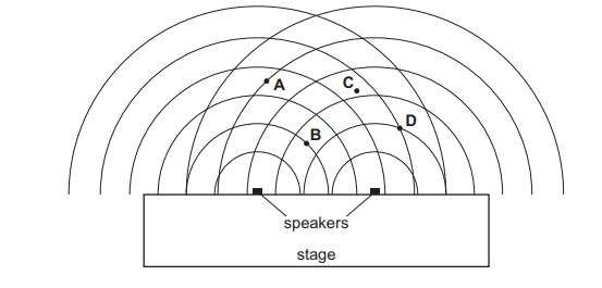 An outdoor concert has two large speakers beside the stage for broadcasting music. In order to test the speakers, they are made to emit sound of the same wavelength and the same amplitude. The curved lines in the diagram represent wavefronts. Where is the loudest sound heard?
