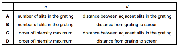 is used to calculate the wavelength λ of light in an experiment that uses a diffraction grating. The light from the diffraction grating is displayed on a screen. What do the symbols n and d represent?