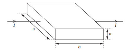 The block has sides of length a, b and c as shown, and its volume is V. Each charge carrier has a charge –q and the number density of the charge carriers in the metal is n. It takes each charge carrier an average time of t to pass through the block. What is an expression for the current I?