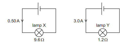 The circuit diagrams show two lamps X and Y each connected to a cell. The current in lamp X is 0.50A and its resistance is 9.6 Ω. The current in lamp Y is 3.0A and its resistance is 1.2 Ω.