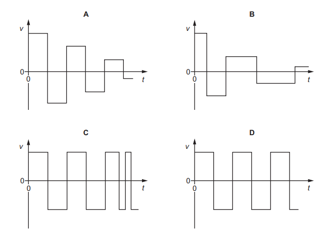 At each end of the air track, the glider has a perfectly elastic collision with a fixed buffer. The glider moves at a constant speed between collisions. Which graph represents the variation with time t of the velocity v of the glider as it moves between the two buffers?