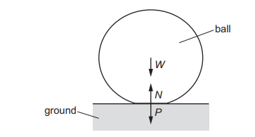 A ball is dropped onto horizontal ground and bounces vertically upwards. When the ball is in contact with the ground, the following forces act: