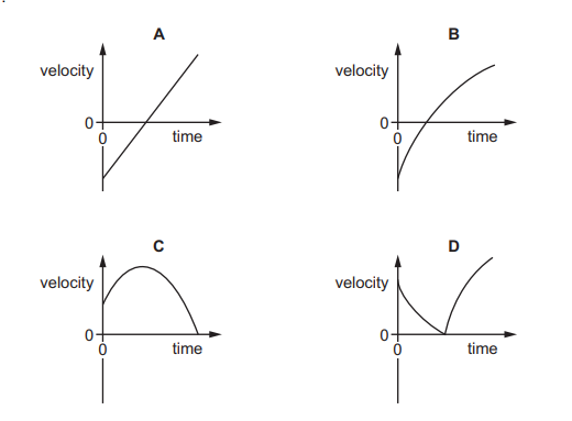 A person stands on the edge of a high cliff that is next to the sea. The person throws a stone vertically upwards. Air resistance acts on the stone. The stone eventually hits the sea. Which velocity–time graph best shows the motion of the stone from when it is released until it hits the sea?