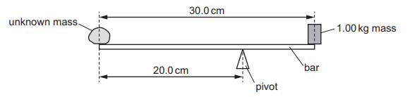 An unknown mass and a 1.00 kg mass are fixed at opposite ends of a bar. The bar has negligible mass and a length of 30.0 cm. The bar balances when supported by a pivot placed 20.0 cm from the unknown mass, as shown