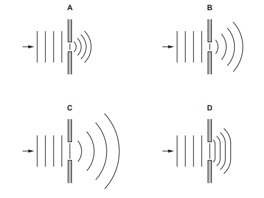The diagrams show the diffraction of water waves in a ripple tank as they pass through a gap between two barriers. Which diagram is correct?