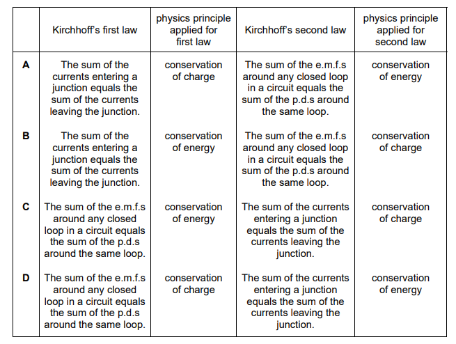 Which row correctly describes Kirchhoff’s laws?