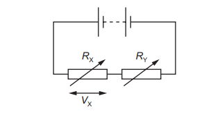 The variable resistors have resistances \(R_X\) and \(R_Y\). \(V_X\) is the potential difference (p.d.) across the variable resistor with resistance \(R_X\). \(R_X\) and \(R_Y\) are both changed at the same time. Which combination of changes must cause \(V_X\) to increase?