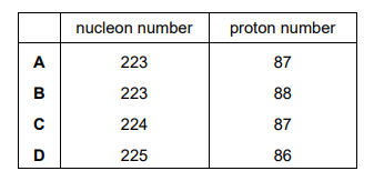 An actinium nucleus has a nucleon number of 227 and a proton number of 89. It decays to form a radium nucleus, emitting a β– particle and an α-particle in the process. What are the nucleon number and the proton number of this radium nucleus?