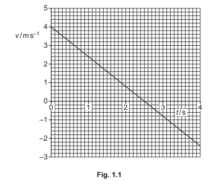 (b) A rock of mass 7.5kg is projected vertically upwards from the surface of a planet. The rock leaves the surface of the planet with a speed of 4.0\(ms^{–1}\) at time t = 0. The variation with time t of the velocity v of the rock is shown in Fig. 1.1.