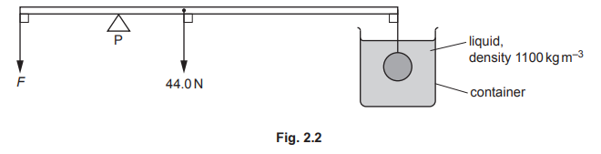 The density of the liquid is \(1100kgm^{–3}\). The upthrust acting on the sphere due to the liquid is 2.5N. The magnitude of F is unchanged so that the horizontal rod is not in equilibrium.