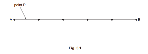 A horizontal string is stretched between two fixed points A and B. A vibrator is used to oscillate the string and produce an observable stationary wave. At one instant, the moving string is straight, as shown in Fig. 5.1.