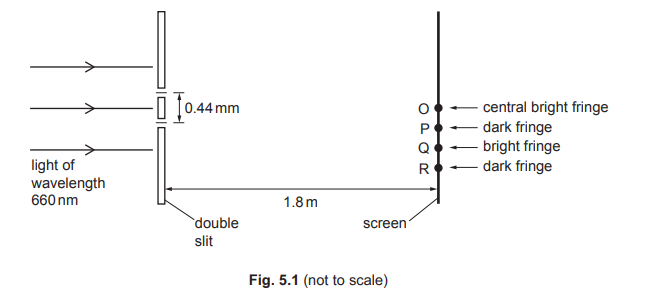 The light of wavelength 660nm is incident normally on two slits that have a separation of 0.44mm. The double slit is parallel to the screen. The perpendicular distance between the double slit and the screen is 1.8m. The central bright fringe on the screen is formed at point O. The next dark fringe below point O is formed at point P. The next bright fringe and the next dark fringe below point P are formed at points Q and R respectively.
