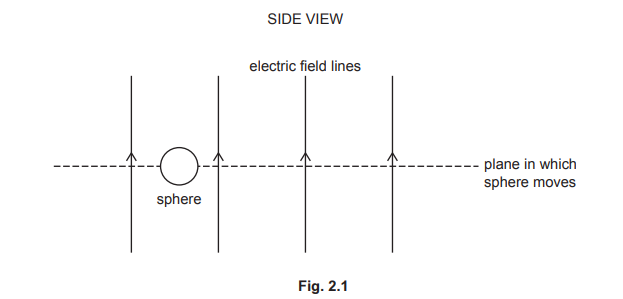 A sphere of mass \(1.6 × 10^{–10} kg\) has a charge of +0.27nC. The sphere is in a uniform electric field that acts vertically upwards, as shown in the side view in Fig. 2.1.