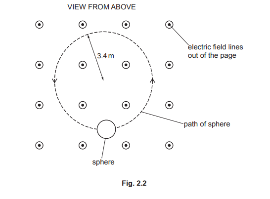 The force exerted on the sphere by the electric field causes the sphere to remain at a fixed vertical height in a horizontal plane. There is a uniform magnetic field in the region of the electric field. The sphere moves at a speed of \(0.78ms^{–1}\) in the horizontal plane. The magnetic field causes the sphere to move in a circular path of radius 3.4m, as shown in the view from above in Fig. 2.2.