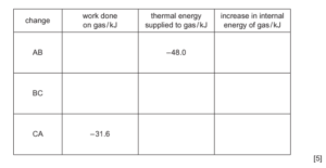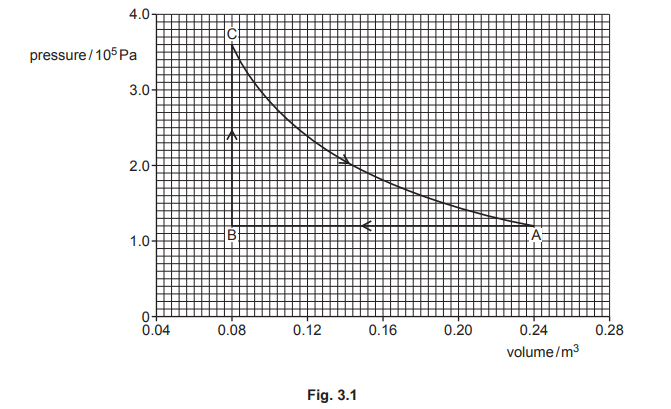 (ii) Complete Table 3.1 to show the work done on the gas, the thermal energy supplied to the gas and the increase in internal energy of the gas, for each of the changes AB, BC and CA.