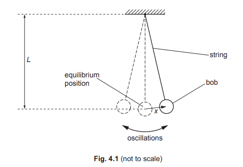 A pendulum consists of a bob (small metal sphere) attached to the end of a piece of string. The other end of the string is attached to a fixed point. The bob oscillates with small oscillations about its equilibrium position, as shown in Fig. 4.1.