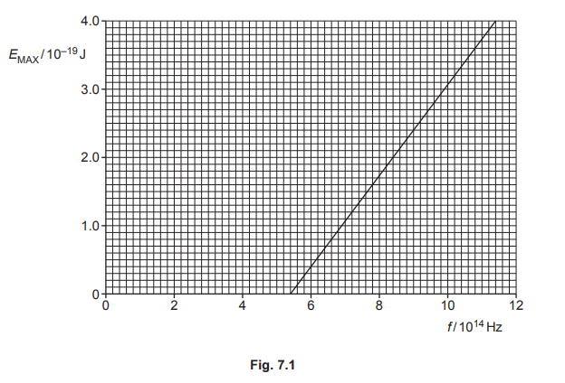 (b) Electromagnetic radiation of a varying frequency f and constant intensity I is used to illuminate a metal surface. At certain frequencies, electrons are emitted from the surface of the metal. The variation with f of the maximum kinetic energy EMAX of the emitted electrons is shown in Fig. 7.1.