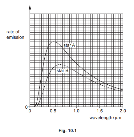 (b) Fig. 10.1 shows the wavelength distributions of electromagnetic radiation emitted by two stars A and B.