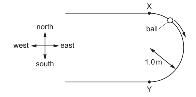 A ball travels from point X to point Y around a semicircular track of radius 1.0 m, as shown.
