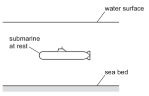 The total mass of the submarine is suddenly decreased by 200 kg by pumping water out of the submarine horizontally in a negligible time. The upthrust acting on the submarine is unchanged.
