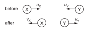 Their initial speeds are $u_{x}$ and $u_{y}$ respectively. After the collision they move apart with speeds $v_{x}$ and $v_{Y}$ respectively. Their directions are shown.